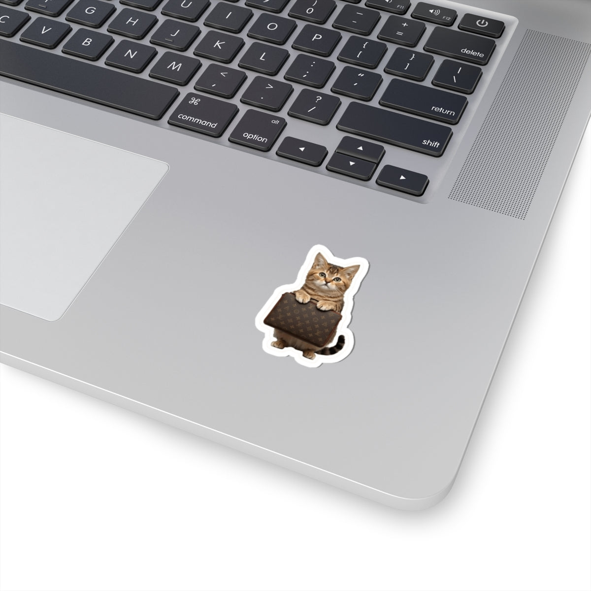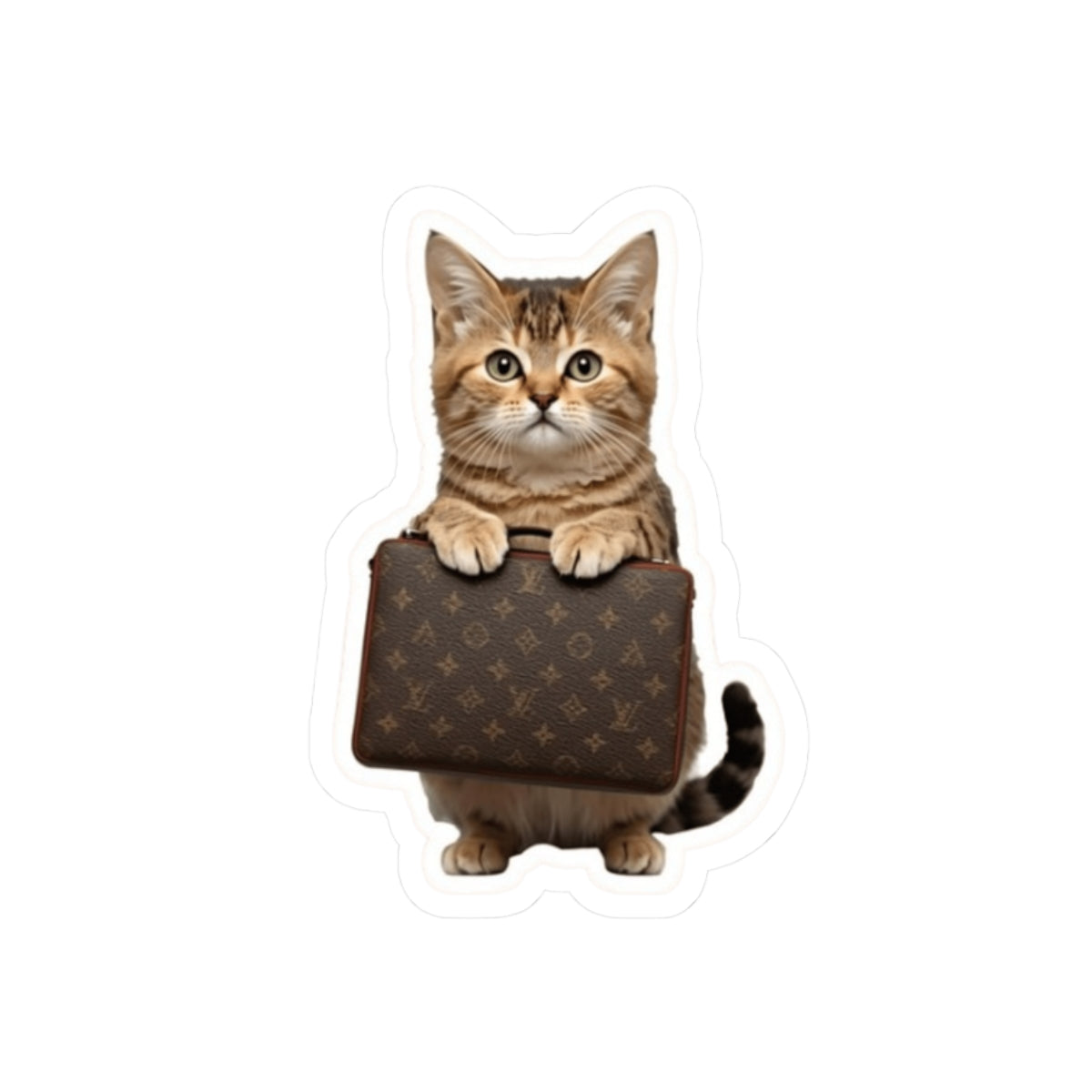Vibrant and cute cat holding a Louis Vuitton bag sticker that is perfect for adding a fun touch to laptops, journals, and windows. Ideal for adults who love cats and fashion, suitable for birthdays, holidays, or everyday decoration.